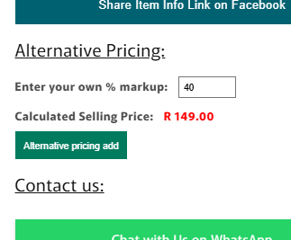 The system instantly calculates your selling price based on the product’s base cost and your markup. Example: A 40% markup gives you a selling price of R149.00. - Click “Alternative Pricing Add”