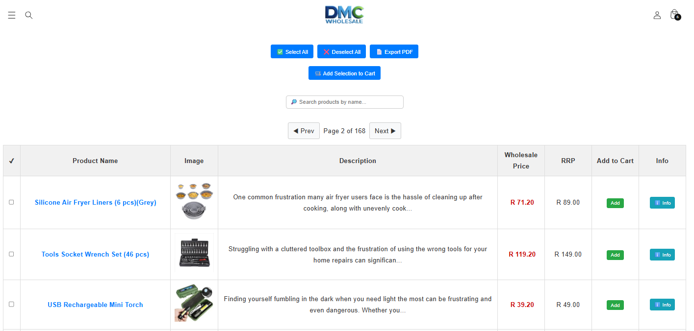 After selecting one or more items, click the Export to PDF button to generate a clean, branded product sheet—ideal for WhatsApp quoting or customer reference.