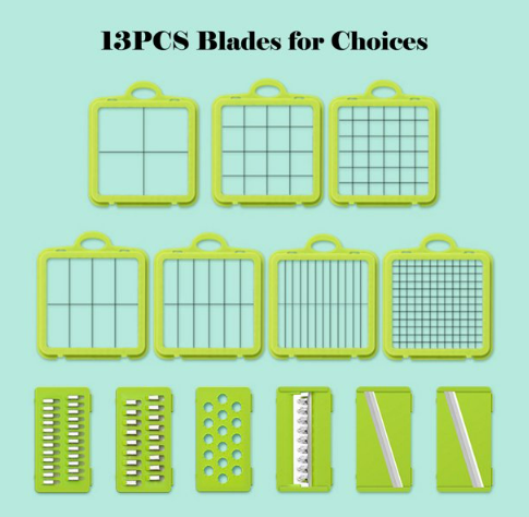 With 13 interchangeable blades and an extra peeler, through which you can get a big or small, thick or thin slice, shreds, or julienne.