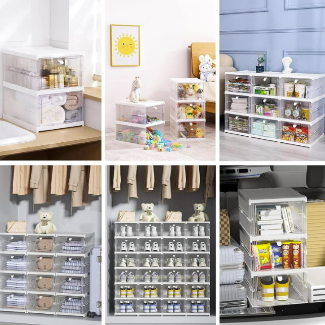 Size: 25x34x87cm. This large-capacity shoe box basically meets our various types of shoe storage needs, including high heels, sports shoes, leather shoes , casual shoes, hiking shoes, etc. Foldable design, easy to carry when moving or camping. After unfolding, the top and bottom of the shoe cabinet are spliced with each other and all have card slots, any set of cabinets will not fall over, and the transparent door panel makes it easy to find the shoes that are more suitable for you at the end. Foldable shoe boxes with lids, no tools, no installation, a set of shoe boxes is divided into 3 layers. You only need three simple steps to open a beautiful shoe storage box